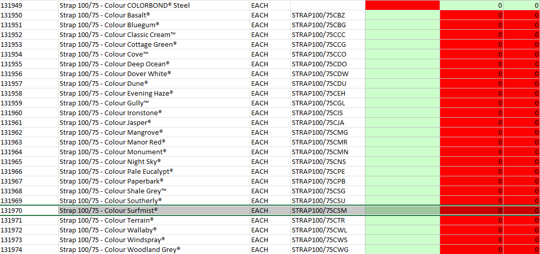 You can then search that file for the item number in the designer message. Once you’ve found the correct item, check to make sure that there is an order code, price and unit filled in. For coloured items the individual item will need its own order code however you will only need to fill in a price and unit for the main “COLORBOND Steel” item.