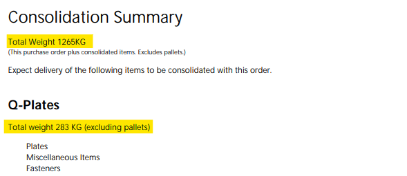 Metroll will have it’s own weight listed under the items as with all purchase orders; however, it will also show a consolidation summary on the following page which includes weights for all consolidated deliveries. Note the plates and fasteners weights will be combined here if they were consolidated prior.