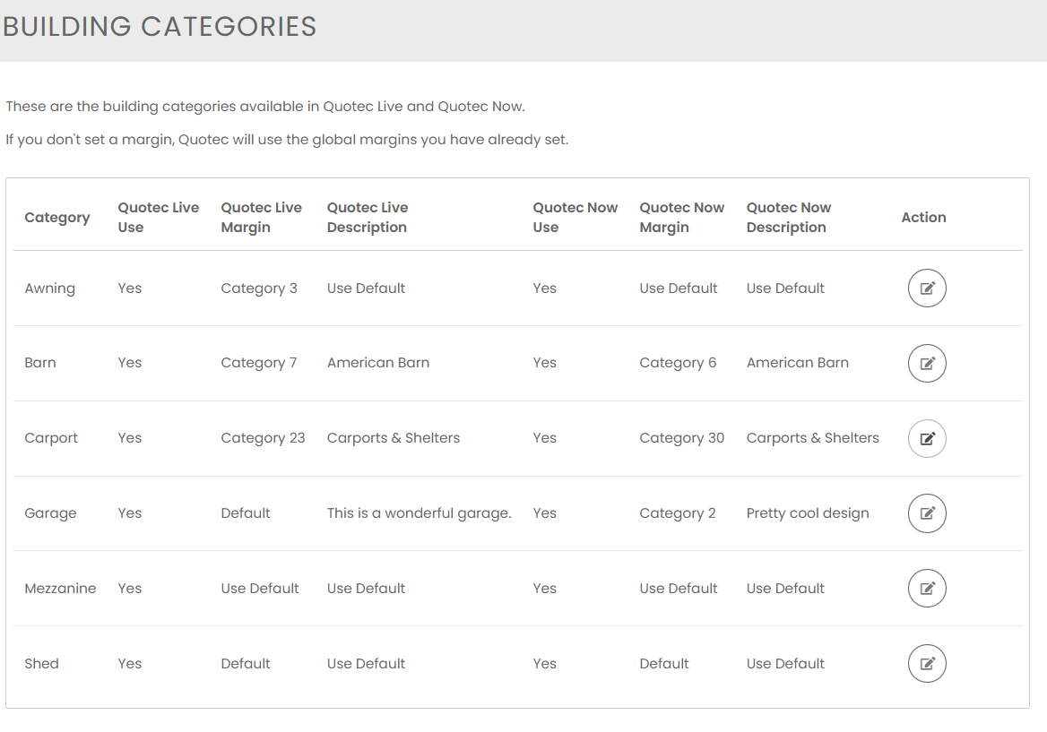 Set a default margin for a specific building category, e.g. garages 5%, carports 8%.