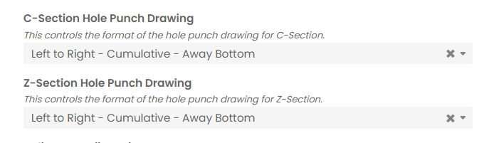 You can specify these options for both C-Section and Z-Section. Go to your steel supplier to the Ordering section and use C-Section Hole Punch Drawing and Z-Section Hole Punch Drawing options.